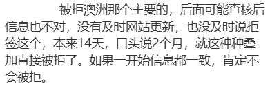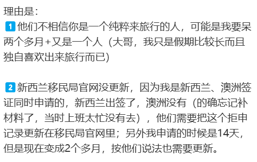 第二:她曾同时申请澳洲和新西兰签证,然而澳洲签证因未及时补交材料,导致拒签,且这一拒签纪录并未同步更新至新西兰移民局的官网上,也就是她的申请档案里面。