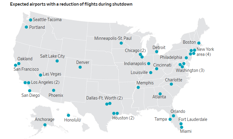 纽约、旧金山、洛杉矶、芝加哥、亚特兰大等主要枢纽机场都在削减名单内,如果下周仍无法恢复拨款,美国航空网络可能将进入“半瘫痪状态”。