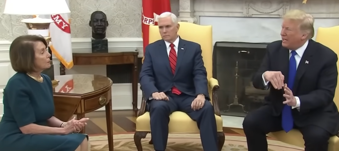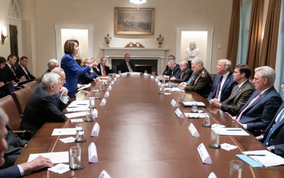 2018年12月,在佩洛西正式重返众议院议长之位前不久,她和参议院民主党领袖舒默与特朗普在椭圆形办公室见面,这场事关“美墨边境建墙拨款”的会面最终演变成了媒体镜头前的激烈争吵。