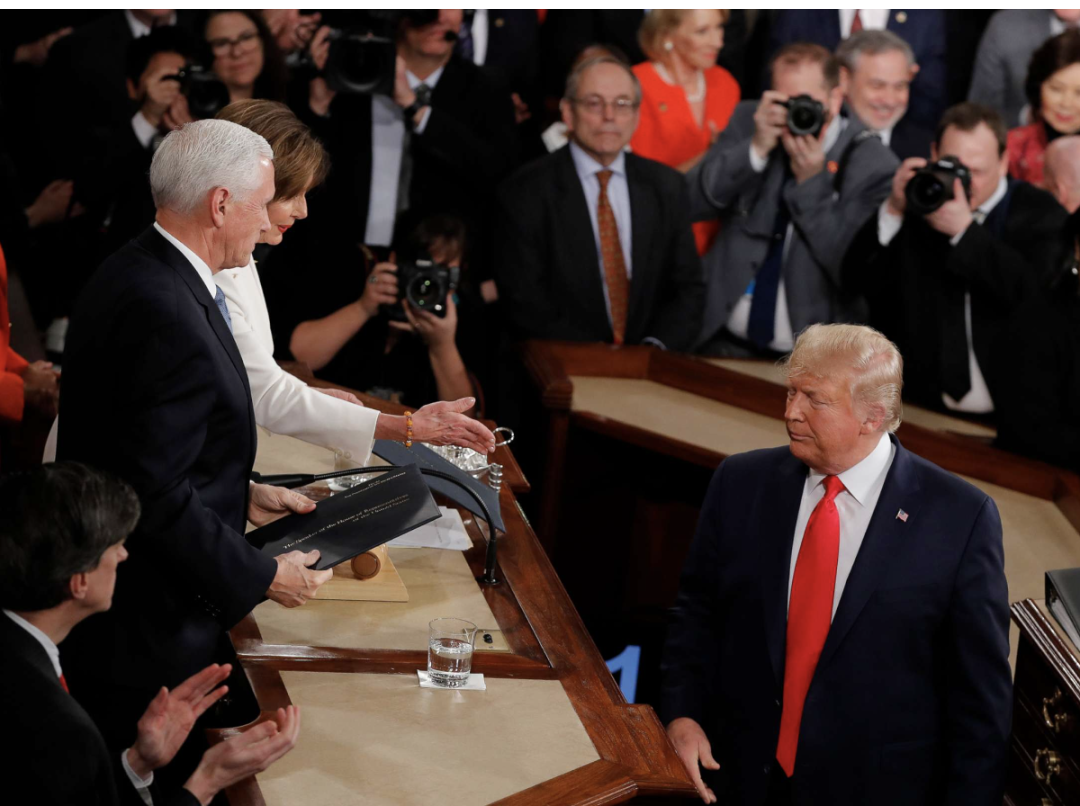 佩洛西对着镜头撕了特朗普的演讲稿副本,而特朗普则拒绝了佩洛西的握手。