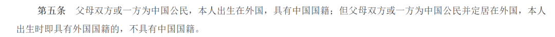 中国的国籍法第五条已经明确规定:“父母双方或一方为中国公民,本人出生在外国,具有中国国籍。”
