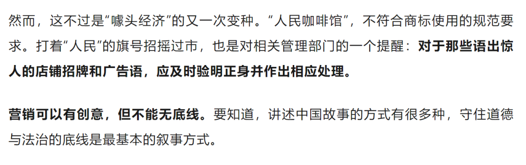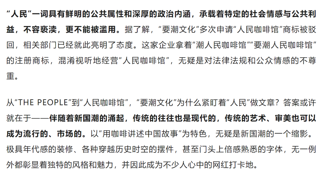 有网友表示,“人民”一词具有强烈的公共属性和政治内涵,被用于商业咖啡馆的标识,令人感到突兀和不适。其店标因使用“人民”字样,法律合规性也遭到质疑。