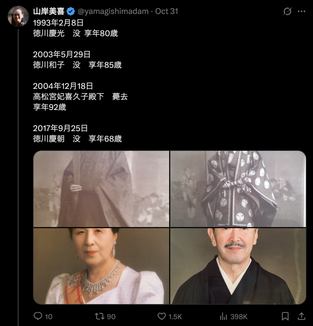 发帖的山岸美喜其实是德川家康的后代,也是末代将军德川庆喜的玄孙。