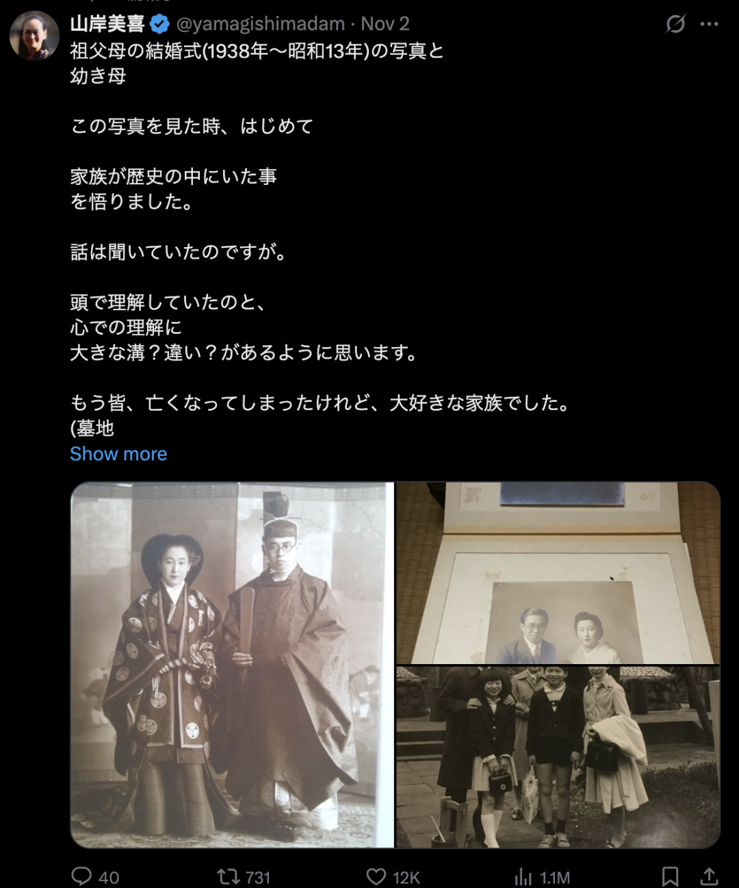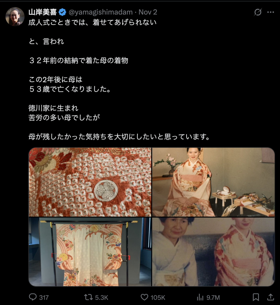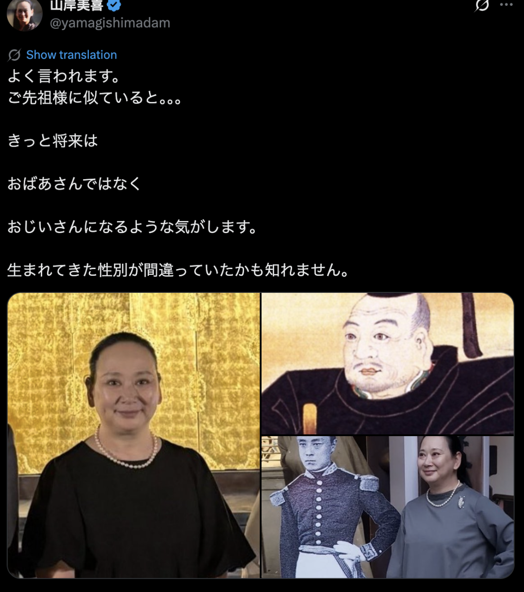 如今,山岸美喜的脸成了活动版历史教材。她穿和服时,日本网友直呼“殿下”,她晒生活照时,有人感慨“仿佛看到退休后喝茶的德川家康”。