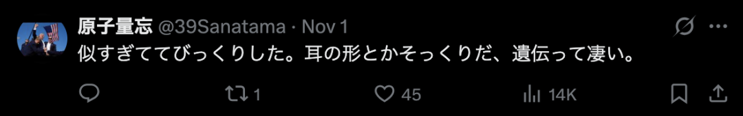 “我惊讶地发现他们竟然如此相似。就连耳朵的形状都一样。基因真是太神奇了。”