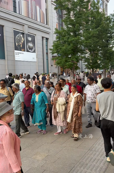 上海南京路,有人偶遇庞大的印度旅行团;