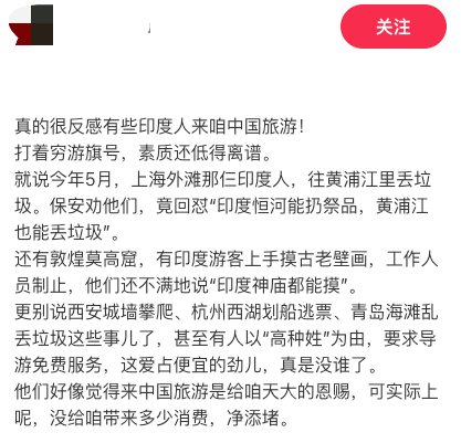 有人吐槽道:“真的很反感有些印度人来咱中国旅游!打着穷游旗号,素质还低得离谱。上海外滩往黄浦江里丢垃圾还理直气壮:‘恒河能扔祭品,黄浦江也能丢。’敦煌摸壁画、西湖逃票、青岛乱丢垃圾……真是离谱到家。”