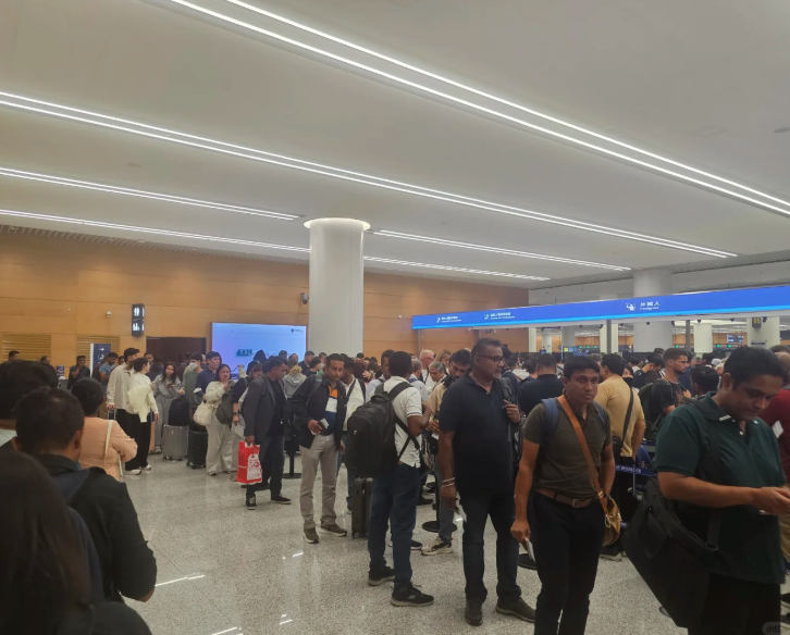 成都天府机场的画面也挺魔幻,一位网友早上六点排入境队,抬头一看,