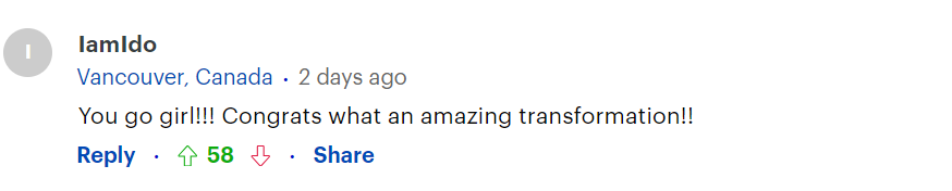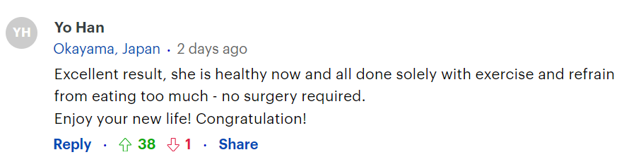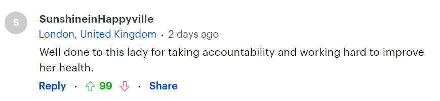 这位女士勇于承担责任,努力改善自己的健康状况,我们向她致敬。