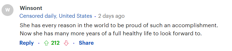 她完全有理由为这样的成就感到骄傲。现在,她还可以期待未来许多年的健康生活。