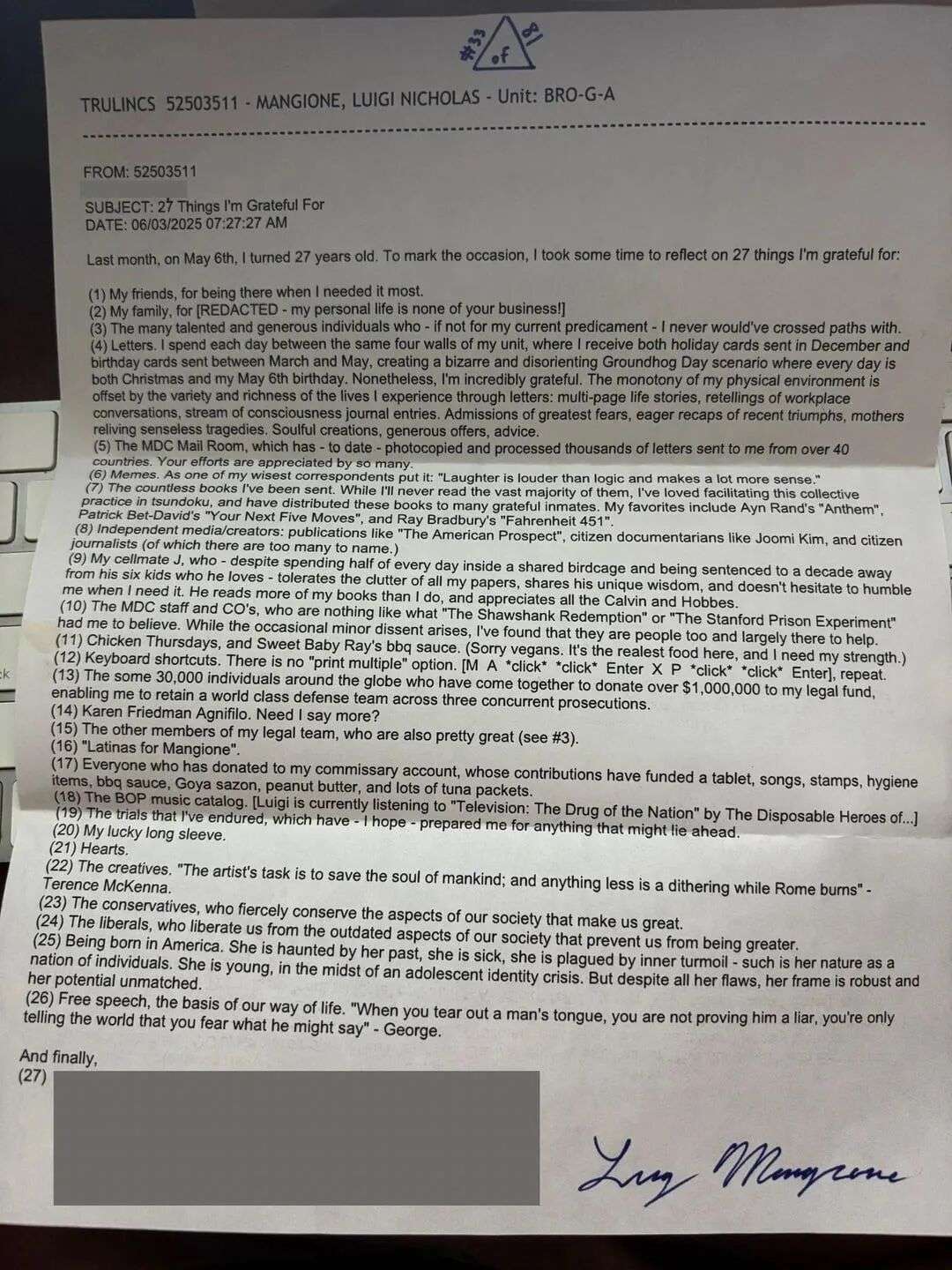 名单以他的朋友、家人和“致某某某【已编辑-我的私生活与你无关!】”为开头。这也是路易吉很少见的,提到了自己的私生活,有爆料人认为,他是在狱中遇到了爱情??