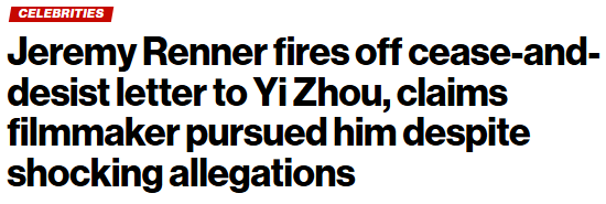 近日,好莱坞男星、“漫威宇宙”中“鹰眼”一角的演员杰瑞米·雷纳(Jeremy Renner),身陷与中国导演周依(Yi Zhou)之间的性骚扰争议事件。
