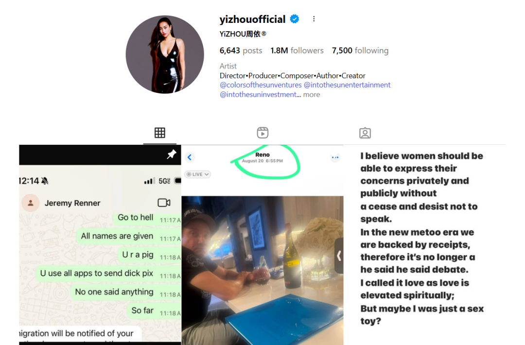 中国女导演周依表示,雷纳曾对她发送大量的私密不雅照,明显性暗示的文字内容,更是在曾酒后对她大吼两小时,甚至威胁要“报警并联系美国移民局(ICE)”以恐吓她。