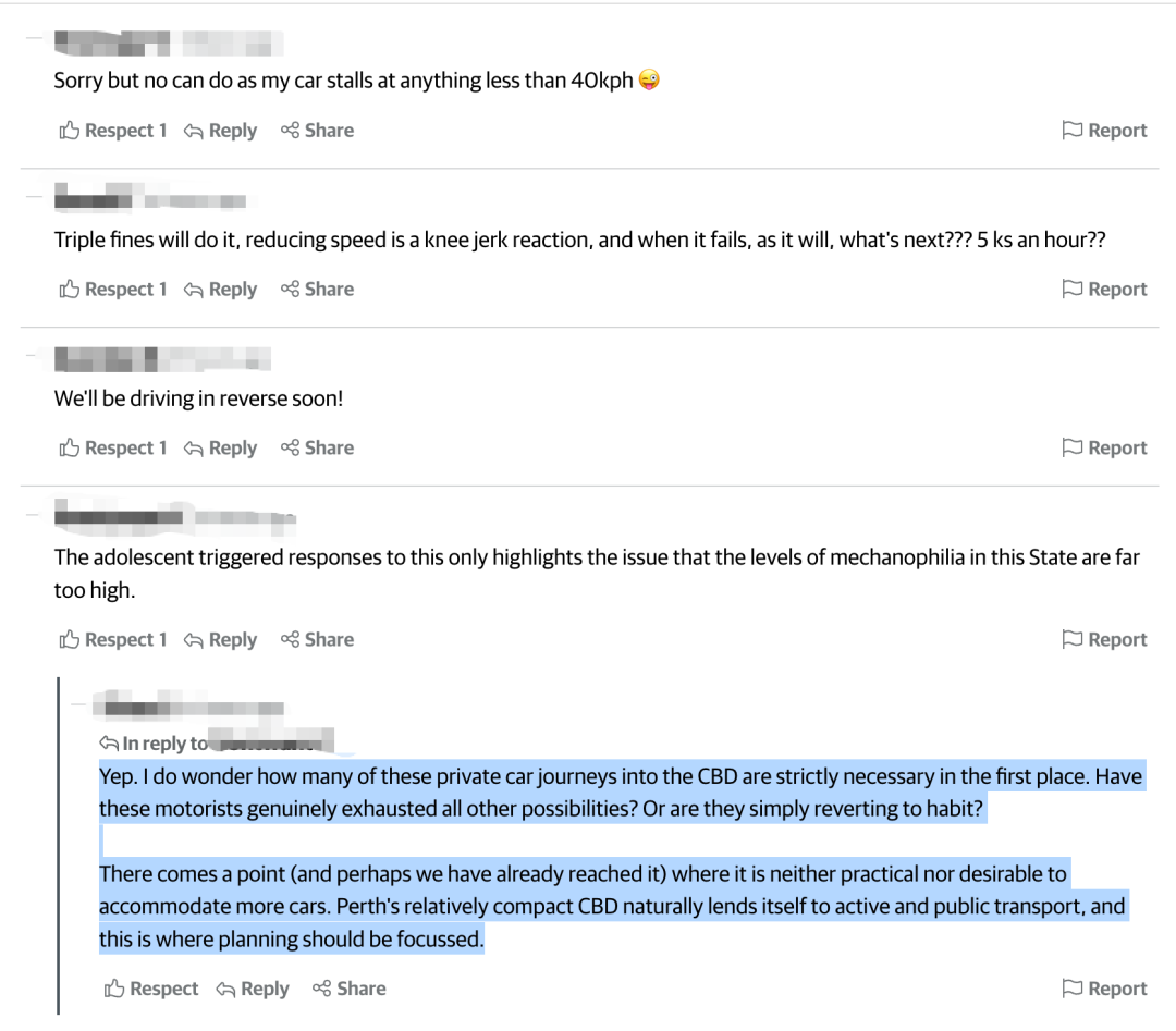 今年早些时候,珀斯市进行的一项民意调查收到了590份回复,结果显示虽然意见不尽相同,但多数受访者支持实施更低的限速标准。