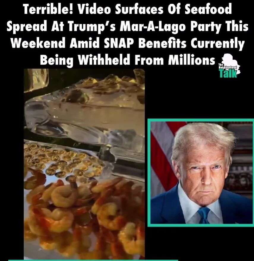 特朗普的纸醉金迷和等待“食品券”救济的美国民众形成鲜明反差。美国网民评论道,“可怕!特朗普本周在海湖庄园的海鲜盛宴正值数百万SNAP福利被扣之际”,“看看特朗普的海鲜大餐,至少他们不会在海湖庄园挨饿。”