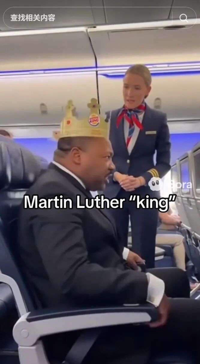 另一位被重点恶搞的美国黑人民权运动领袖马丁·路德·金,戴着汉堡王纸帽,在飞机上跟空姐吵架: