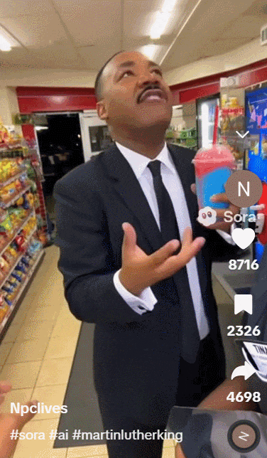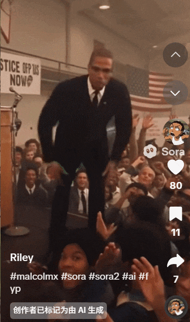 值得一提的是,Open AI在发布Sora 2时,将“历史人物”排除在了肖像使用限制之外,也就是任何人都可以制作关于公众人物的AI视频,包括活动家、明星以及政治领袖等。