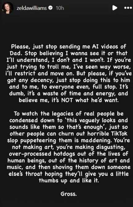 罗宾·威廉姆斯的女儿塞尔达·瑞·威廉姆斯(Zelda Rae Williams)直接在ins上发帖称,不愿再看到父亲的AI视频: