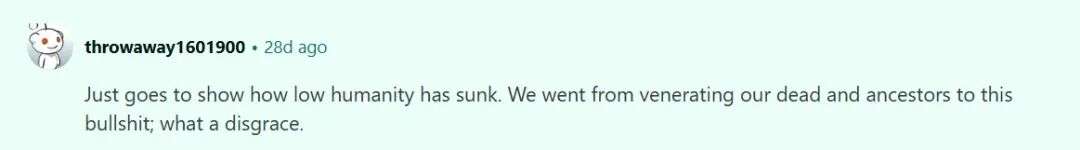 “这恰恰说明了人性已经堕落到何种地步。我们曾经敬重逝者和祖先,如今如此荒唐,真是耻辱。”