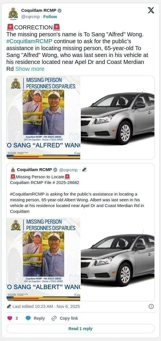 任何知情人士或见过 Wong 的人士,请致电高贵林皇家骑警 604-945-1550,并提及档案 2025-28682。