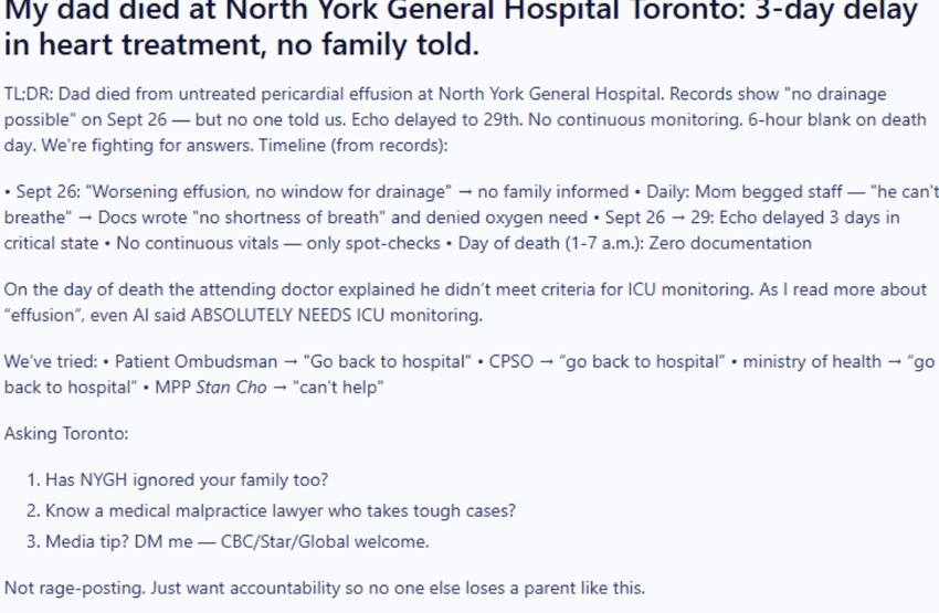 这条帖子迅速登上多伦多Reddit热门榜。评论区里,越来越多网友现身说法,讲述自己在北约克全科医院的噩梦经历。