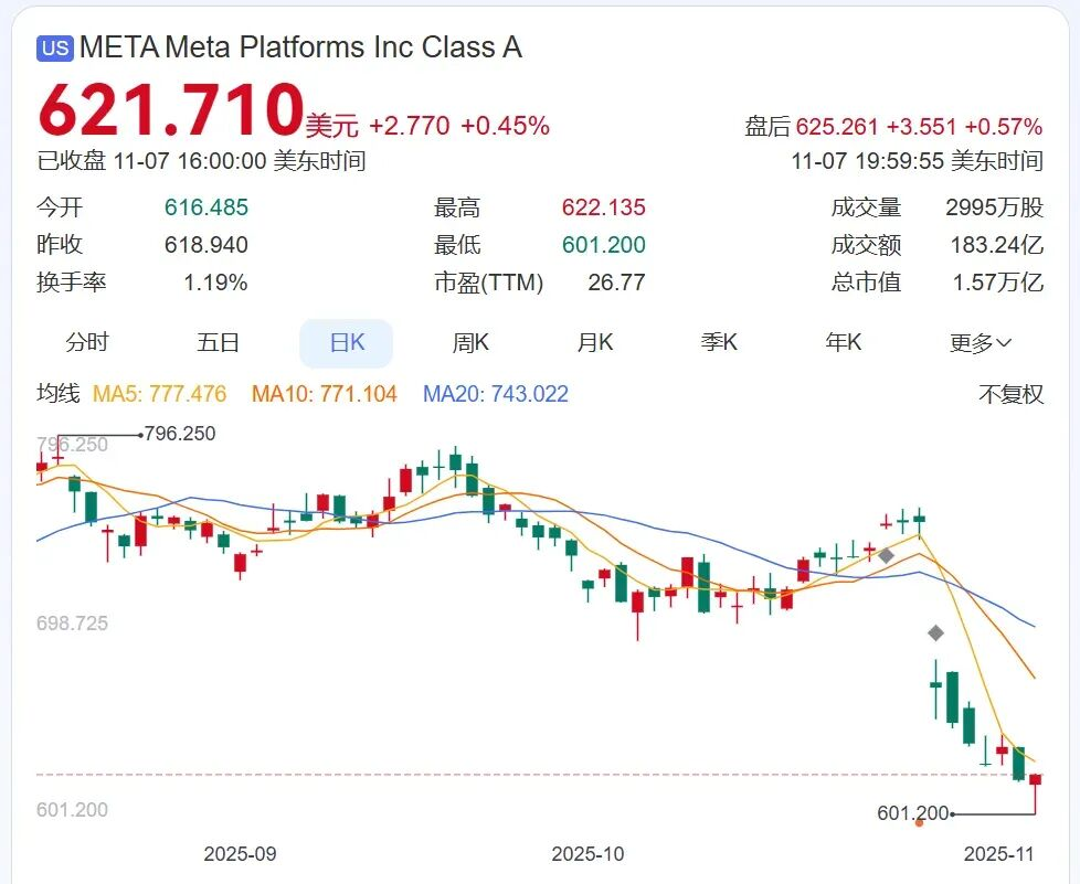 10月末,Meta公布2025年第三季度财报,尽管营收实现26%的同比增长,但因净利润锐减83%,股价大跌11.33%,创下三年来最大单日跌幅,市值蒸发2147亿美元。
