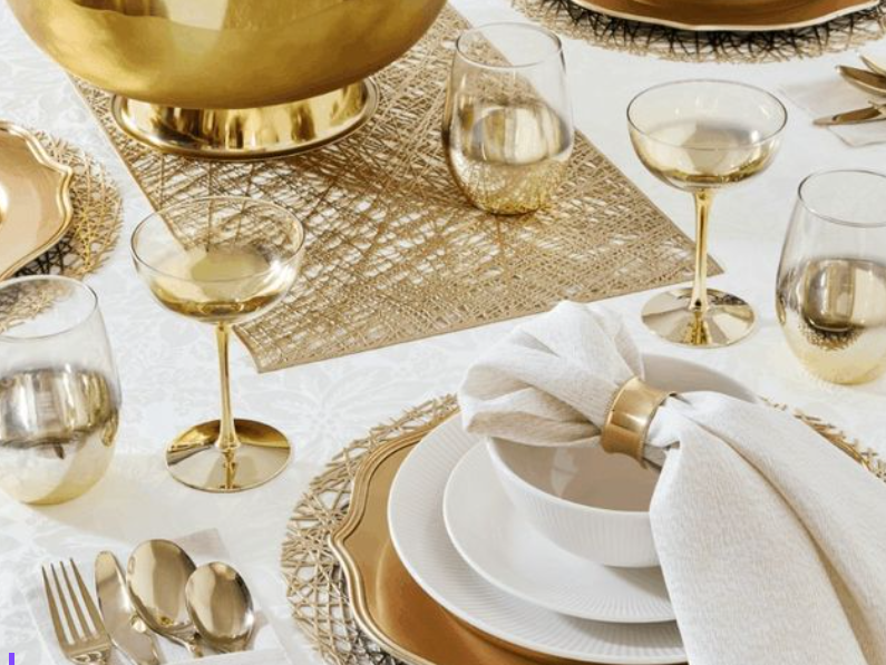 金色无脚酒杯或鸡尾酒杯(六只装)$14,金色餐巾环(四个)$5,金色酒桶 $16,金属光泽餐巾(四张)$5,金色鸡尾酒摇壶 $15。