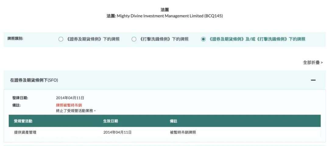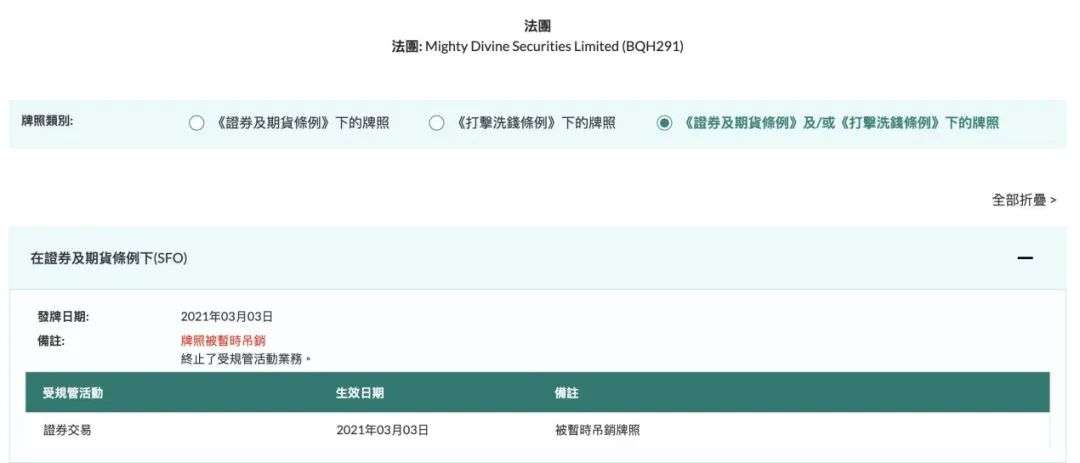 近日,香港证监会与香港保监局也同时出手,对上述三家公司相关牌照采取行动。记者查询中国香港证监会官网发现,Mighty Divine Investment Management Limited和Mighty Divine Securities Limited的牌照均已被处置,显示“牌照被暂时吊销”以及“终止了受规管活动业务”。