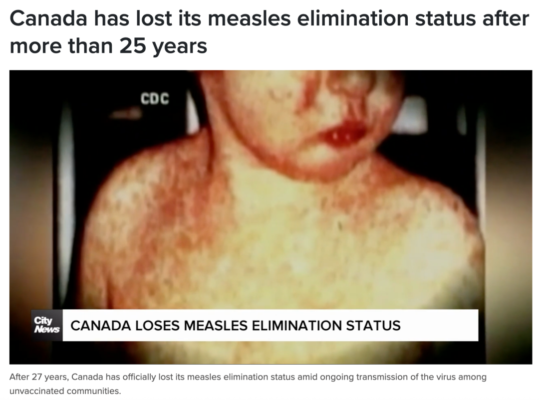 美洲卫生组织(PAHO)在审查加拿大的流行病学与实验室数据后指出,同一株麻疹病毒在境内持续传播已超过一年,因而撤销加拿大的「麻疹消除认证」。
