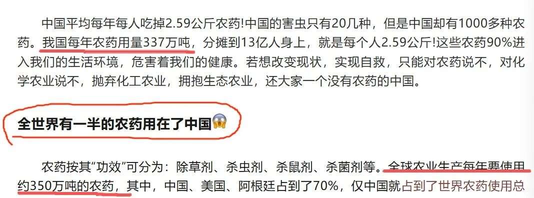 “中国一年用掉337万吨农药,占全球50%”、“人均年吞农药2.59公斤”、“每公顷用量是美国4.7倍。”