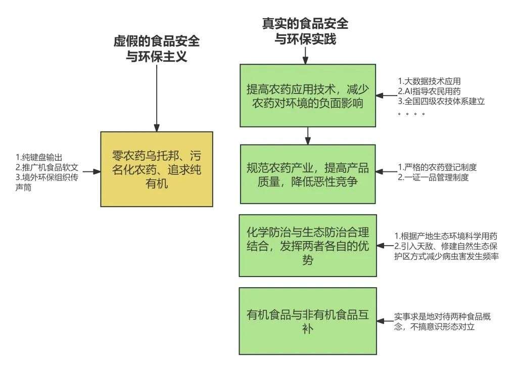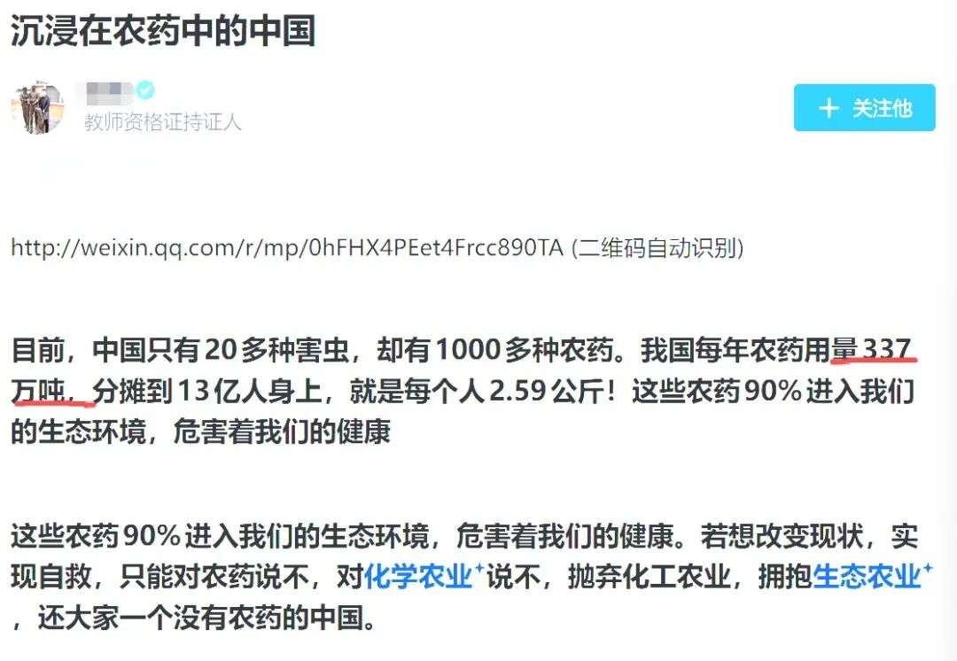 因此,像《浸泡在农药里的中国人》这类脱离现实基础的软文,与其说是为粮食安全发声的社会良知,不如说是为了推广有机农产品生意而不惜歪曲现实以谋取利益的投机者。他们精准地戳中了民众对粮食安全的普遍焦虑,点燃了极端环保主义者对零农药乌托邦的无限憧憬。无论如何,这些言论都不过是脱离实际的无根之谈。