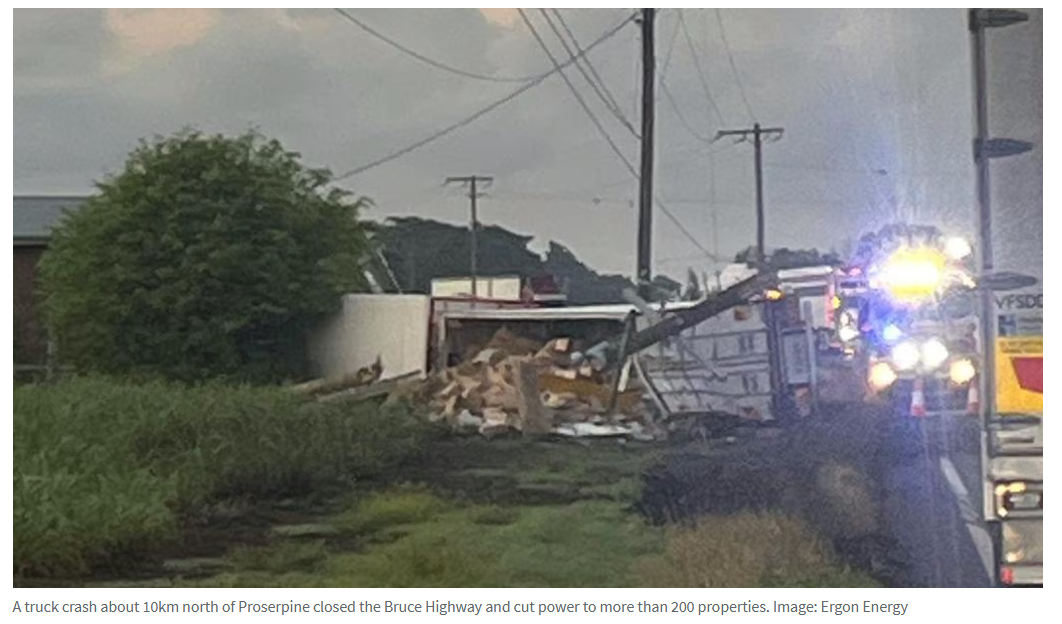 周二凌晨4点左右,一辆卡车在Proserpine以北约10公里处的Myrtlevale发生侧翻事故,导致电线杆断裂、电缆垂落路面,警方被迫对Bruce Highway实施数小时的双向封闭。