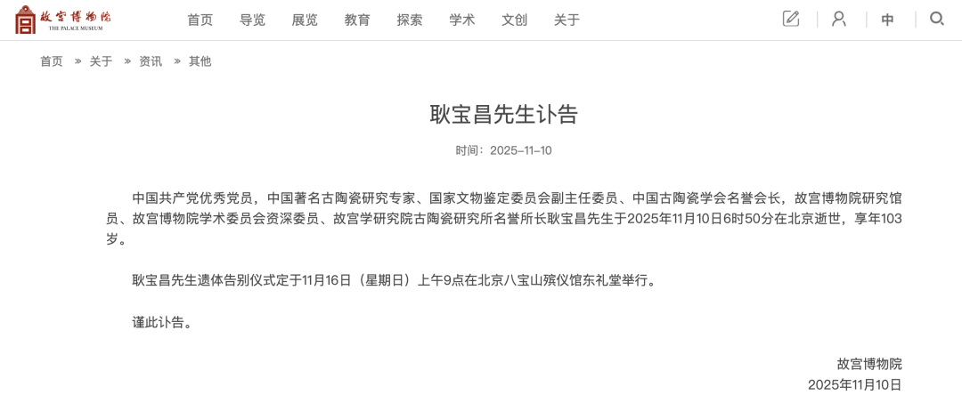 故宫博物院11月10日发布讣告,中国共产党优秀党员,中国著名古陶瓷研究专家、国家文物鉴定委员会副主任委员、中国古陶瓷学会名誉会长,故宫博物院研究馆员、故宫博物院学术委员会资深委员、故宫学研究院古陶瓷研究所名誉所长耿宝昌先生于2025年11月10日6时50分在北京逝世,享年103岁。
