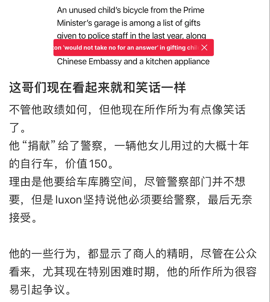 还有网友评论称:“Luxon从当选国家党党魁到成为一国总理,浑身上下都散发着‘商人般的精明’,从不考虑社会观感。”