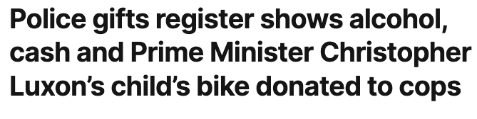 其中一份特别引人注目:一辆来自总理Christopher Luxon车库的旧的儿童自行车,送给了负责保护他的警员。