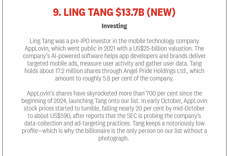 自2024年初以来,AppLovin 的股价暴涨超过 700%,这也让唐玲一举跻身加拿大富豪榜。