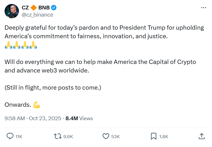 赵长鹏对此在社交平台X上发文表示,他“深深感激”特朗普“维护了美国对公平、创新和正义的承诺”。