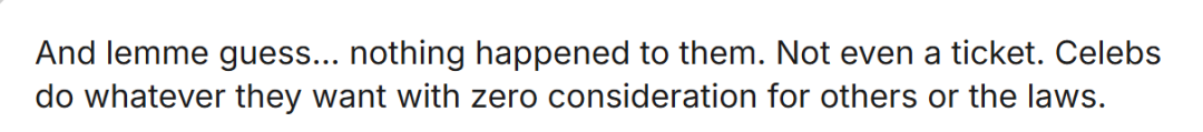 “肯定啥事都没有,估计警察连张罚单都不会开。名人想做什么就做什么,完全可以无视他人和法律。”