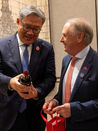 Don Farrell还与中国商务部长王文涛举行了会谈。据报道,Don Farrell赠送给王文涛一瓶南澳产的葡萄酒,王文涛则赠送给他一个中国产的AI同声传译设备。