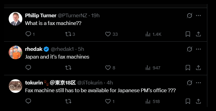 目前,她的这一解释也引起了不少争议,连一些外国人都觉得日本首相居然还在用传真机接收信息很魔幻。新西兰驻韩国前大使菲利普·特纳就在社交媒体上调侃说:“啥是传真机啊?”