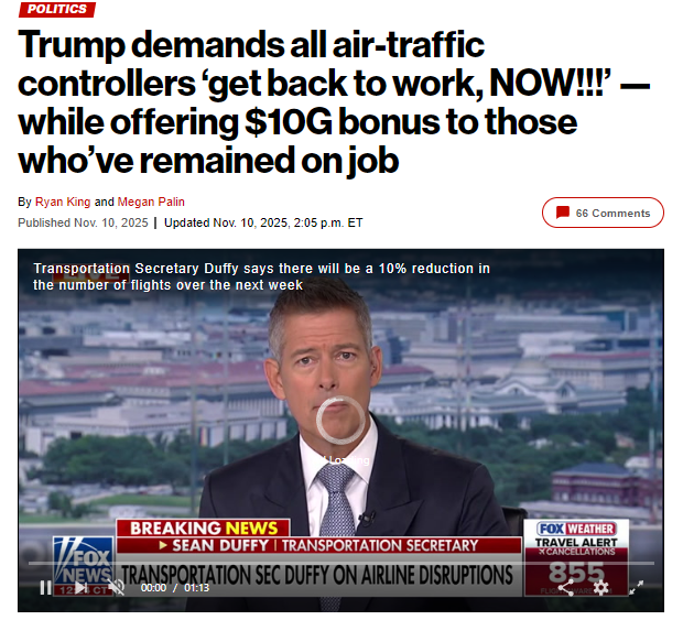 面对接连数周的混乱,美国总统川普(Donald Trump)10日宣布,将对那些在停摆期间仍坚守岗位的航管人员发放1万美元奖金,并警告“不服从者”将被大幅扣薪。