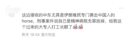 “这边接收的中东尤其是伊朗难民,专门袭击中国人的house,刑事案件说自己精神病就无罪放掉。给我这个过来的大专人打工长眼了。”