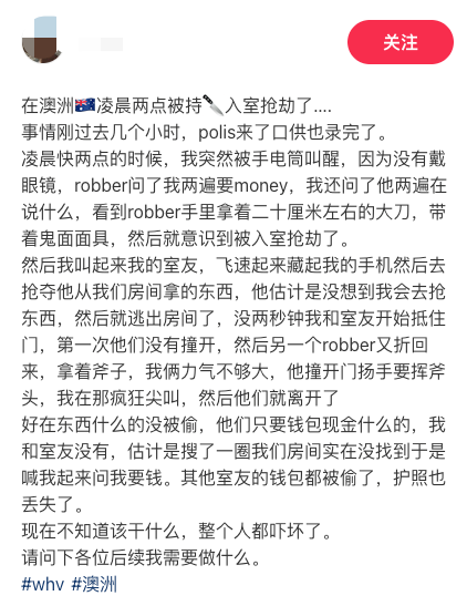 突发!澳洲再曝入室抢劫!中国女孩经历惊魂一夜!