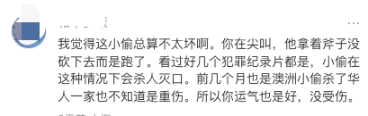 “我觉得这小偷总算不太坏啊。你在尖叫,他拿着斧子没砍下去而是跑了。看过好多纪录片,这种情况很多都会杀人灭口。你是真的命大。”