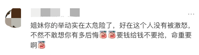 “姐妹你的举动实在太危险了,好在这个人没有被激怒,不然不敢想你有多后悔,要钱给钱,命重要啊!”