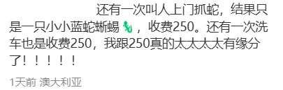 例如:上门抓蛇,收费250澳元;洗车250澳元、维修院子里面的下水道花费5000澳元、儿童托管每天140澳元!