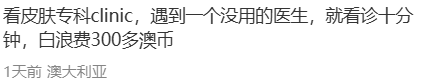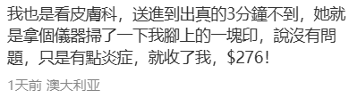 另一皮肤科患者表示,医生只是用仪器给扫描了下脚上的印记,三分钟,秒花费276澳元!