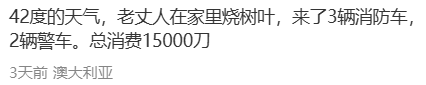 42度高温天气,老丈人在家里焚烧树叶,直接引来三辆消防车与两辆警车,最终被处以1.5万澳元罚款。