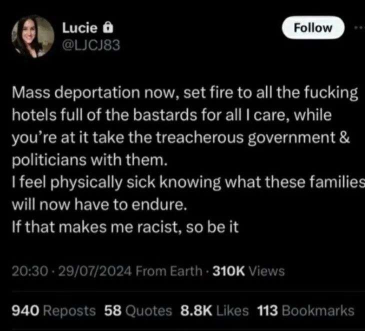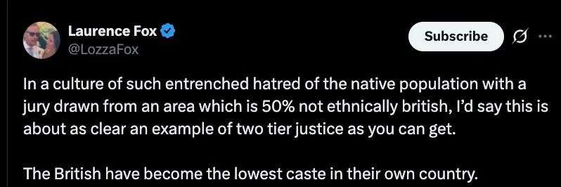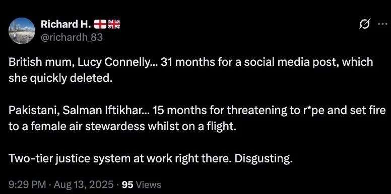 “英国妈妈Lucy Connolly推文快速删除判31个月;巴基斯坦人Salman Iftikhar威胁轮奸和焚烧空乘仅15个月。两级司法系统在运作,恶心。”