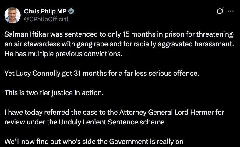 “Salman Iftikhar仅判15个月监禁,却有多次前科,包括威胁轮奸空乘;Lucy Connolly一条不当推文删掉后判31个月。这是‘两级司法’。我已提交过分宽大判决审查。”